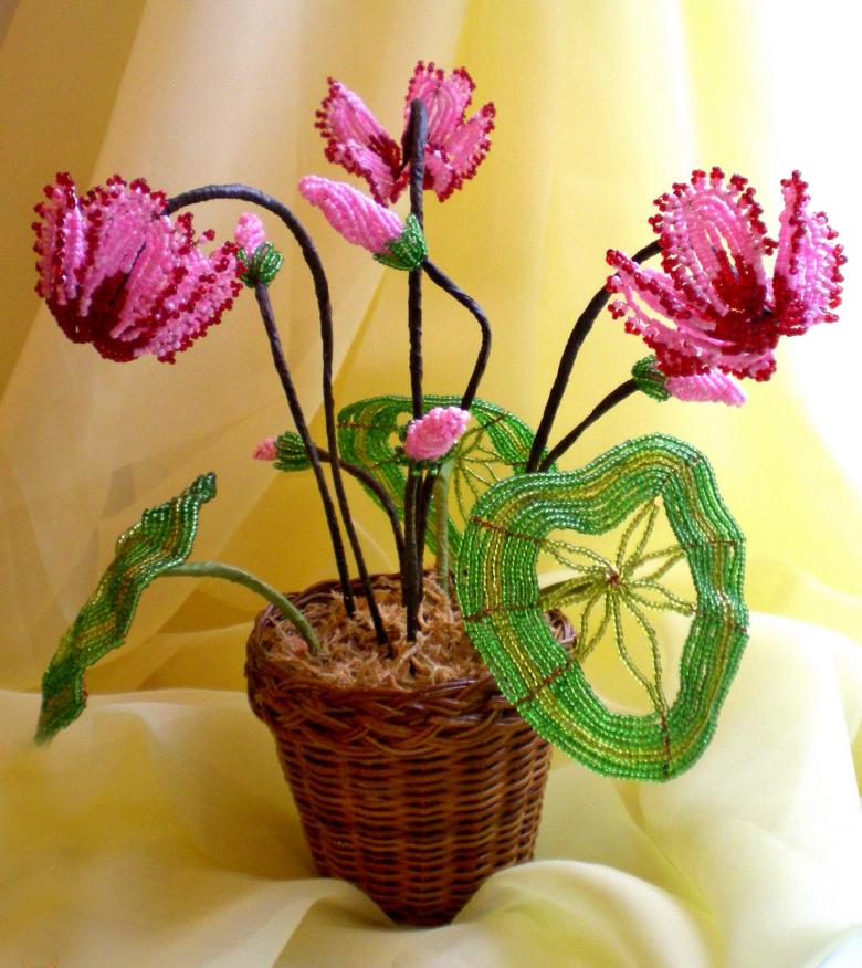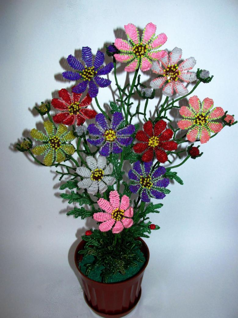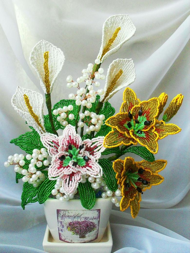 Еще один объект, который достаточно часто создают из бисера – это настоящие трехмерные модели цветов. Как правило, они могут состоять из нескольких веток, которые фиксируют на основе или ставят в вазу, выполненную из бисера или другого материала.