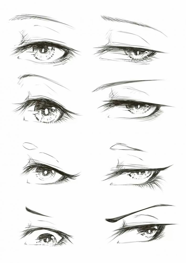 - Прищуренный взгляд рисуется с неполным изображением радужки, часть ее прикрывается веками.