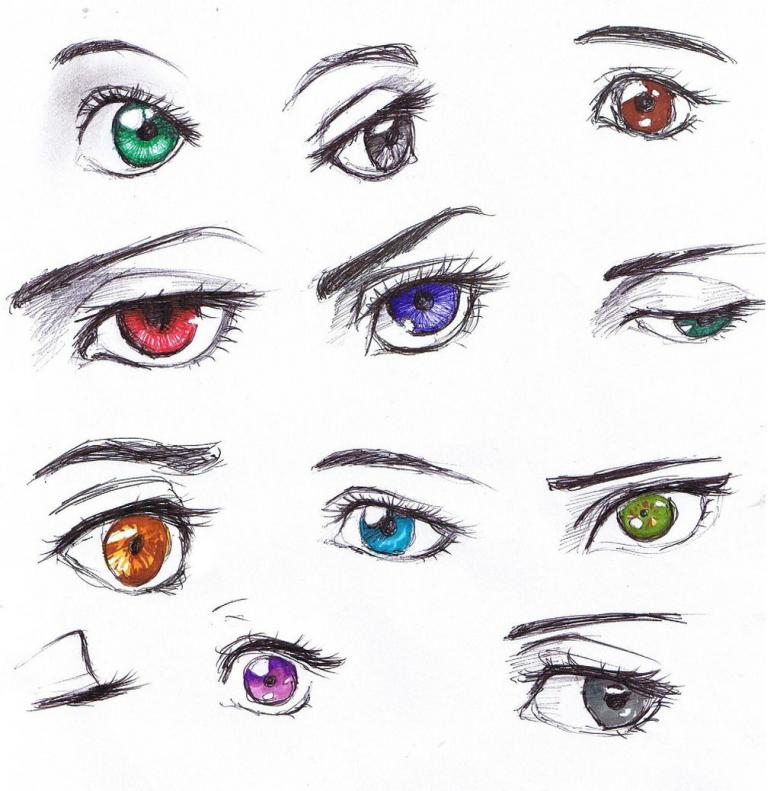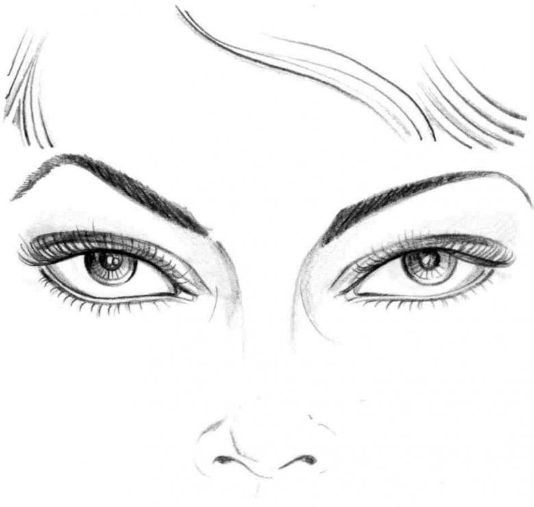 Направление взгляда можно определить по радужке и зрачку. Зрачок всегда обозначается темным кругом, который располагается в центре радужной оболочки. Глаза в спокойном положении они обычно прикрыты на 30 процентов веками.- Широко раскрытые глаза рисуются с полным изображение радужной оболочки.